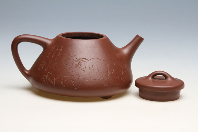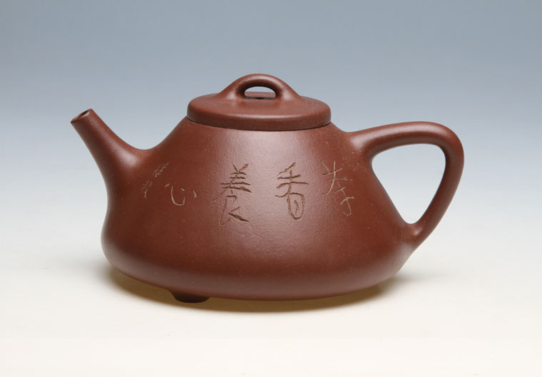 “石瓢”最早称为“石铫”,“铫”在《辞海》中释为“吊子,一种有柄,有流的小烹器”。“铫”从金属器皿变为陶器,最早见于北宋大学士苏轼《试院煎茶》诗:“且学公家作名钦,砖炉石铫行相随”。苏东坡把金属“铫”改为石“铫”,这与当时的茶道有着密切的关系。苏东坡贬官到宜兴蜀山教书,发现当地的紫色砂罐煮茶比铜、铁器皿味道好,于是他就地取材,模仿金属吊子设计了一把既有“流”(壶嘴),又有”梁”(壶提)的砂陶之“铫”用来煮茶,这“铫”也即后人所称的“东坡提梁”壶,这可谓最早的紫砂“石铫”壶。 从留传于世的石铫壶看,至陈曼生、杨彭年时期,已有了很大的变化,更趋向文人化、艺术化。“曼生石铫”主要特色是上小下大,重心下垂,使用稳当,壶嘴为矮而有力的直筒形,出水畅顺,壶身呈“金字塔”式,观赏端庄。“曼生石铫”与“子沾石铫”相比,虽同为彭年所制,但前者更显饱满而丰润,后者则刚烈而古拙,这可能是因人的个性而在壶的艺术上表现。 那么,紫砂“石铫”何时称“石瓢”呢?这应从顾景舟时期说起,顾引用古文“弱水三千,仅饮一瓢”,“石铫”应称“石瓢”,从此相沿均称石瓢壶。